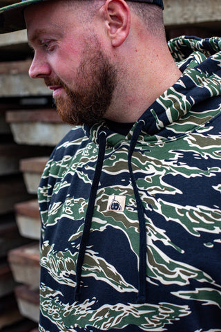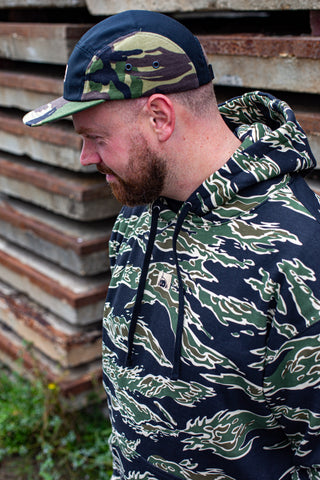 We first saw this one from a couple of hardcore / punk bands in the States years ago, so the search began to find the supplier and to get them imported into Europe - even though with the extra charges thanks to Trump now. Gio personally loves camou and Tiger Stripe is one of his favs, so a hoodie like this in the Monkey Climber range needed to be added.